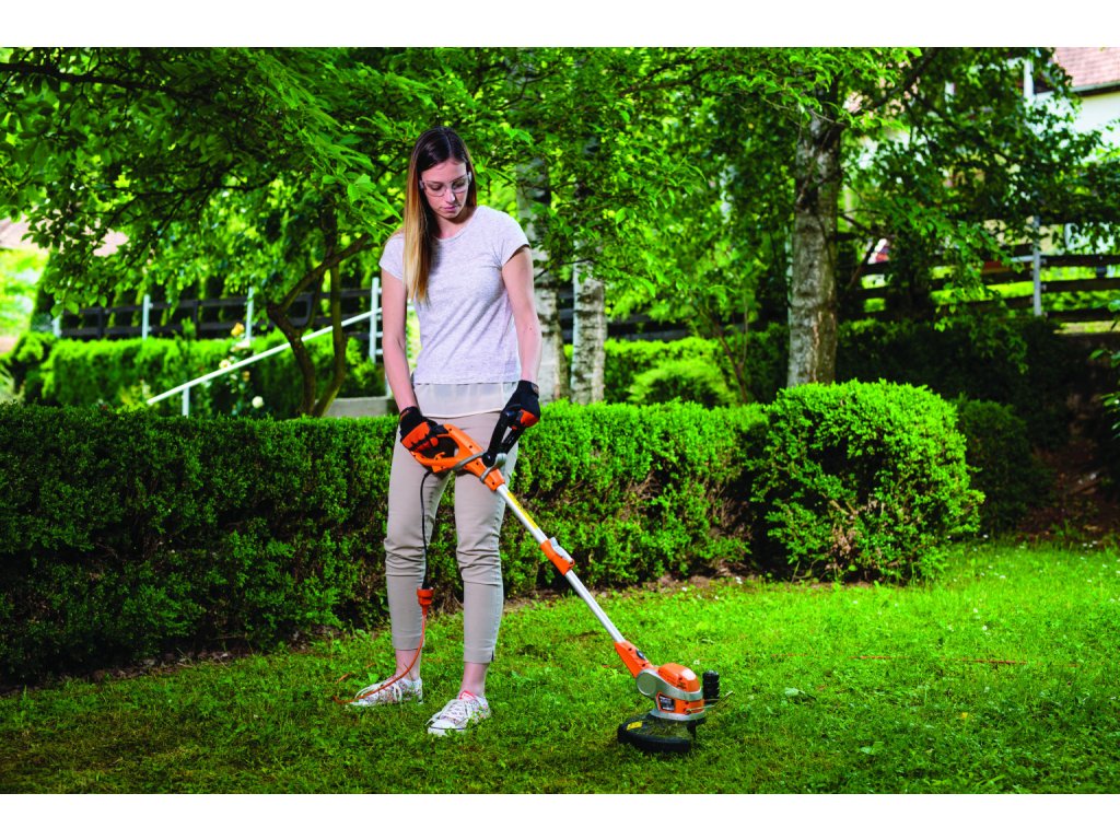 Díky hlavě motoru, kterou lze pro dosažení pohodlného sečení na svislých plochách otáčet o 180° a naklápět do tří poloh, je přístroj univerzálně využitelný. Jeho plynule posuvné teleskopické madlo z hliníku s nastavitelnou přídavnou rukojetí umožňuje pohodlné obouruční vedení a přesné přizpůsobení velikosti těla pro eliminaci únavy při práci. Kryt a přídavná rukojeť jsou vyrobeny z vysoce kvalitního, houževnatého plastu. Přívodní kabel vyžínače je chráněn před opotřebením a poškozením držákem kabelu pro odlehčení tahu, přídavný ochranný kryt chrání uživatele před zvířenými částicemi, jako jsou kameny nebo dřevěné třísky.