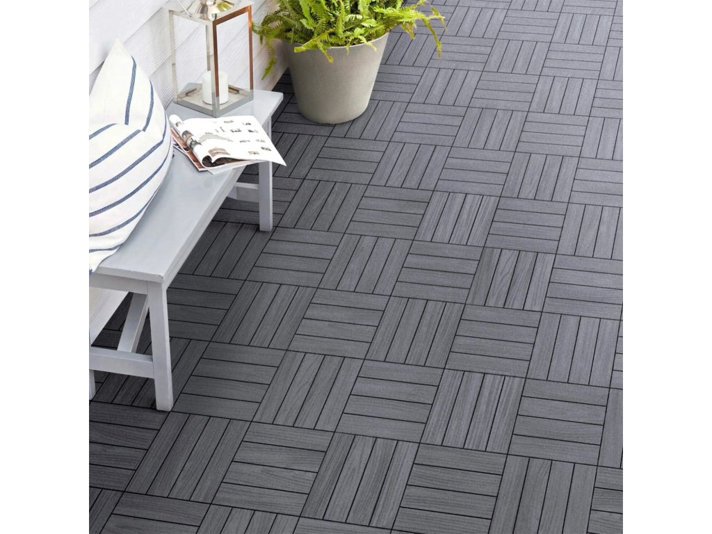Gumová terasová dlaždice Arista v elegantním "dřevěném" designu, v šedé barvě. Vyrobeno z pryžového recyklátu, což zaručuje vysokou odolnost a dlouhou životnost. Velikost 30 x 30 cm