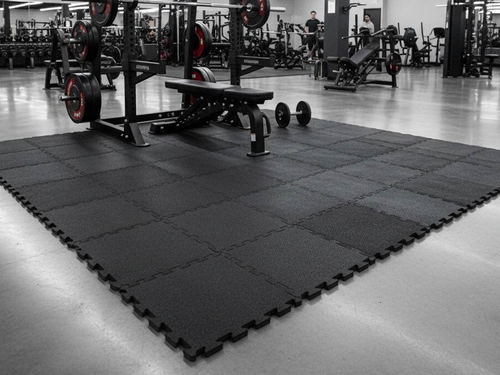 Gumová dlaždice ASLON 485 × 485 mm, černá, puzzle, je ideální pro fitness, garáže a akustickou izolaci díky odolnosti proti opotřebení a snadné instalaci.