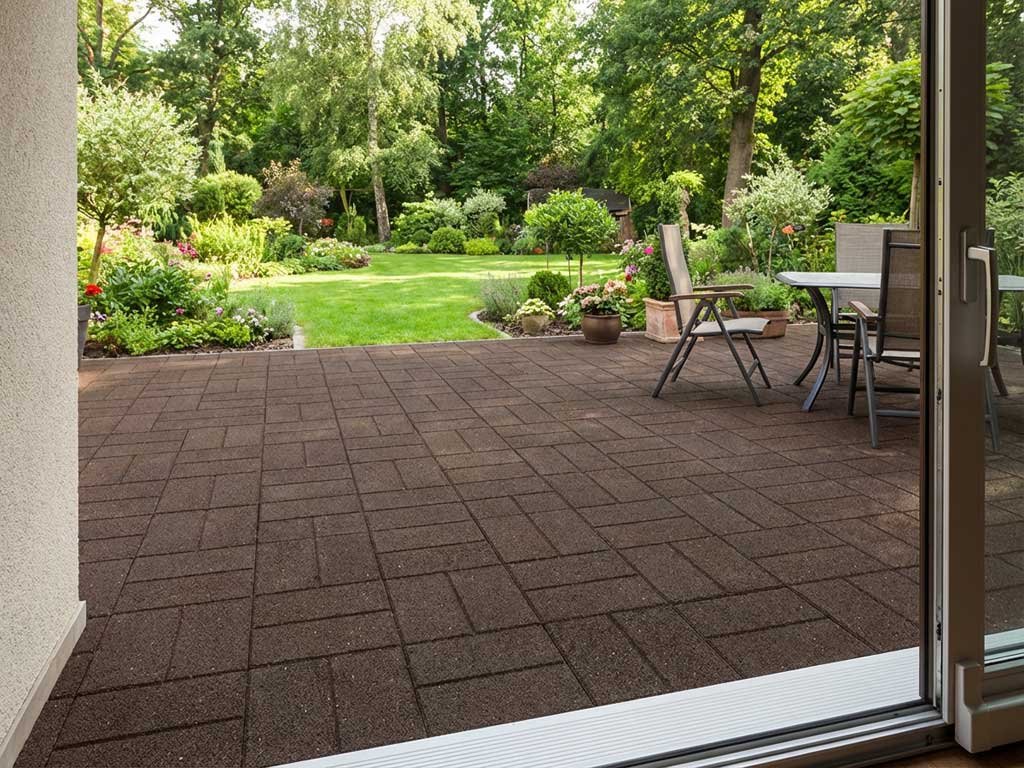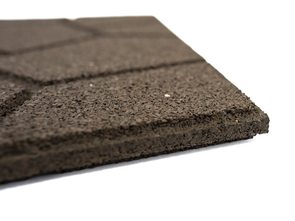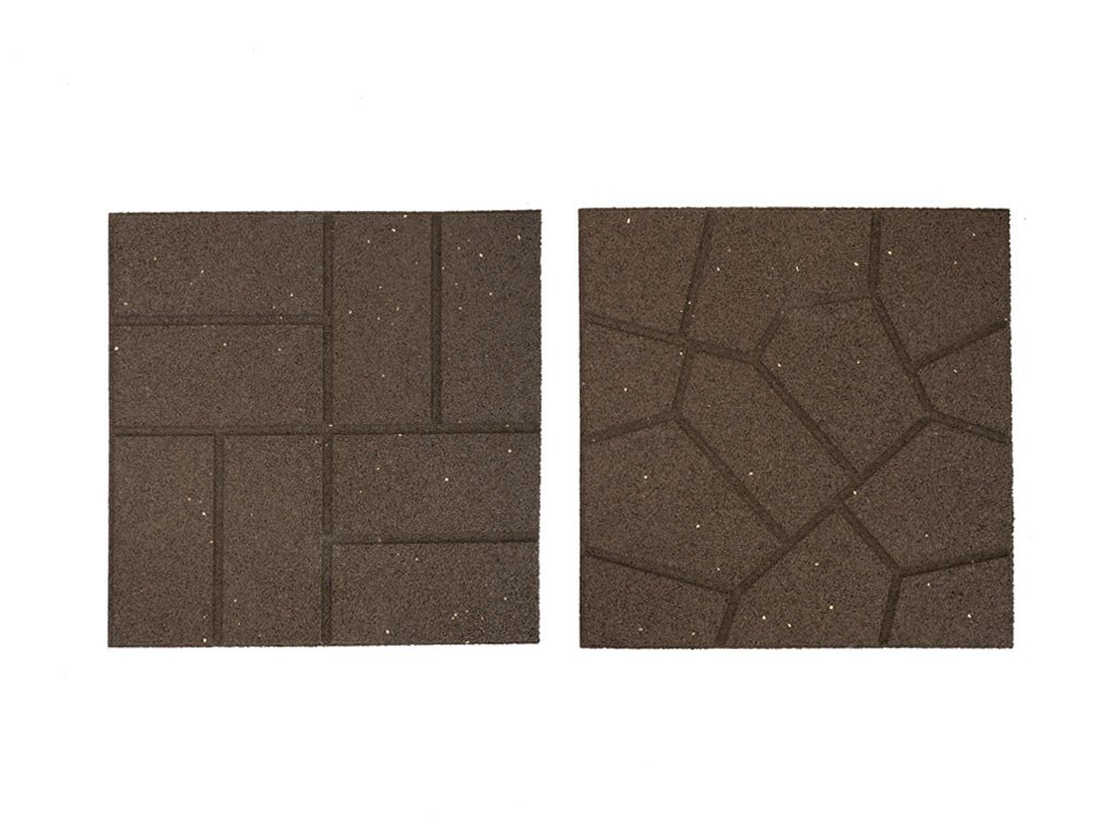 Oboustranná EKO terasová dlažba Brickface hnědá, vyrobena z pryžového recyklátu. Dekorativní dlažba se ideálně hodí na zahradu, terasu nebo cestu. Na každé straně dlaždice je jiný dekor. Velikost dlaždice 40 x 40 cm.
