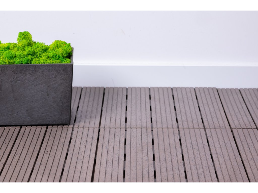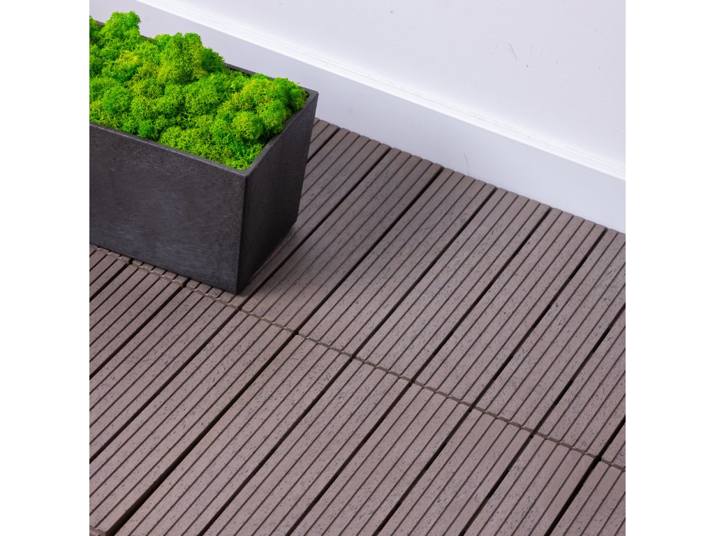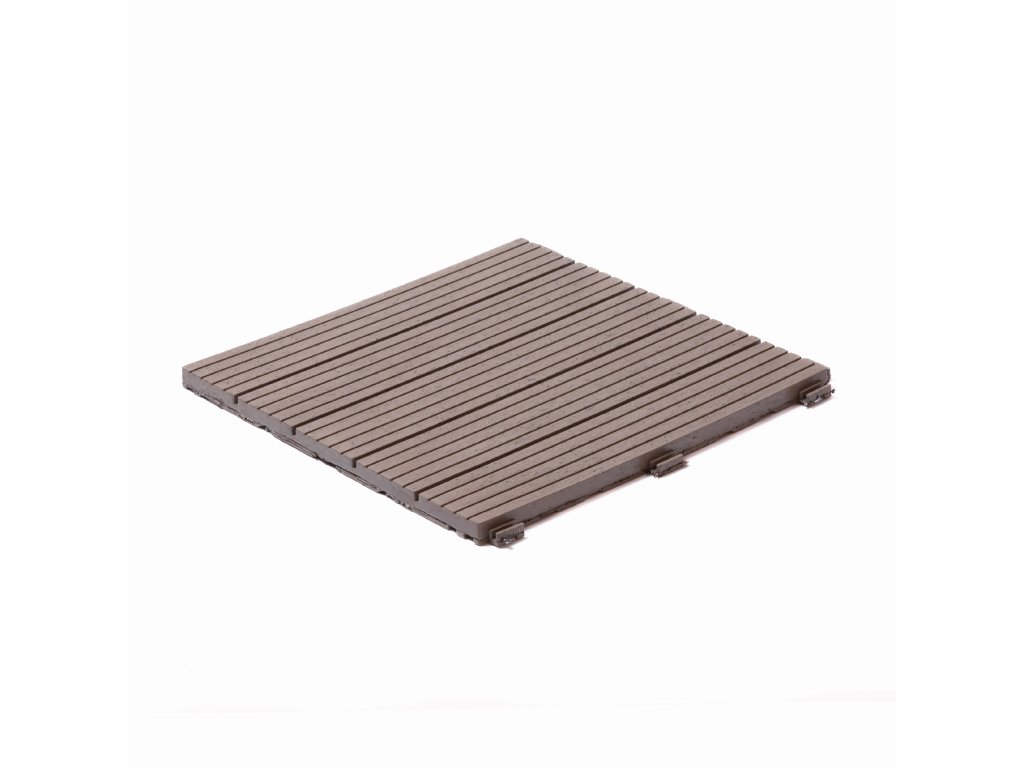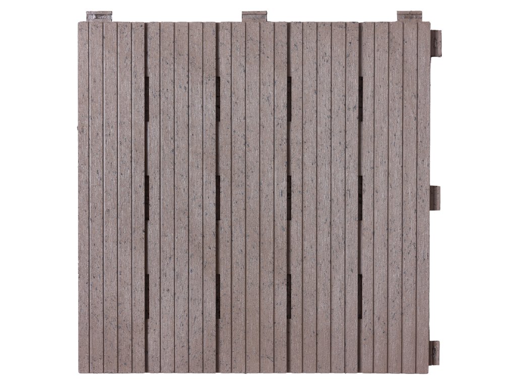 Gumová dlaždice 30 x 30 cm, výška 1,5 cm, v odstínu dubového dřeva. Směs gumové pryže a polypropylenu (100% recyklované materiály) s dlouhou životností a vysokou odolností. Velmi snadná montáž.