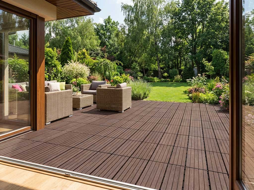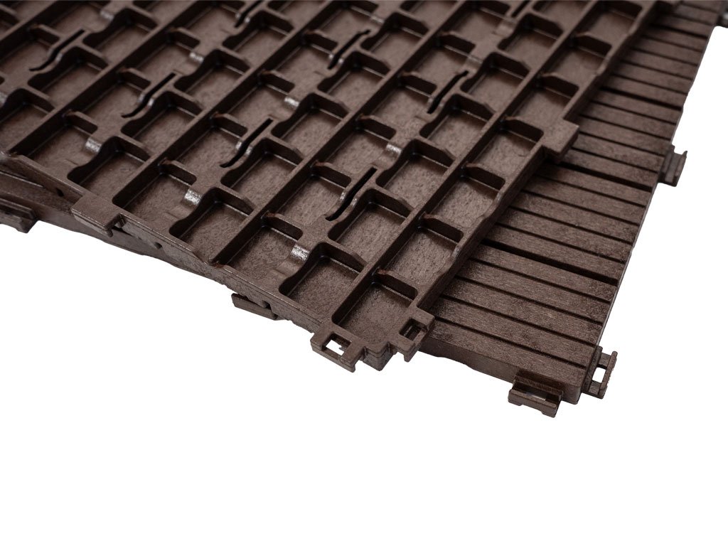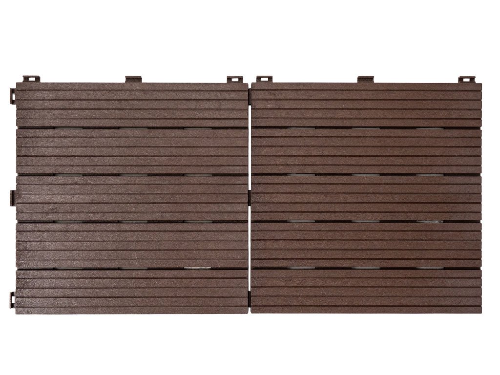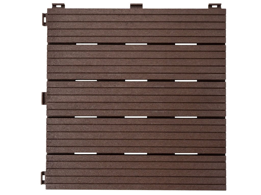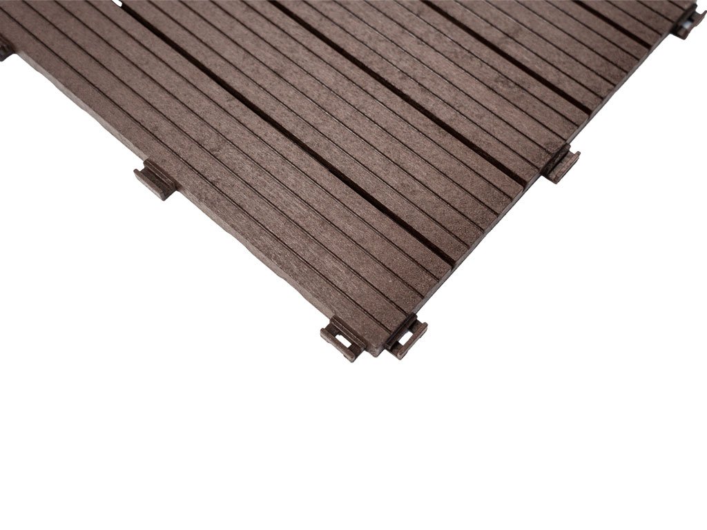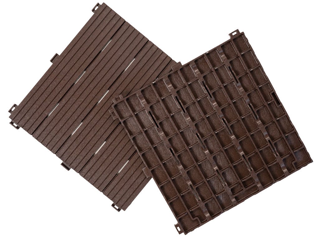 Gumová dlaždice 30 x 30 cm, výška 1,5 cm, v hnědé barvě. Směs gumové pryže a polypropylenu (100% recyklované materiály) s dlouhou životností a vysokou odolností. Velmi snadná montáž.