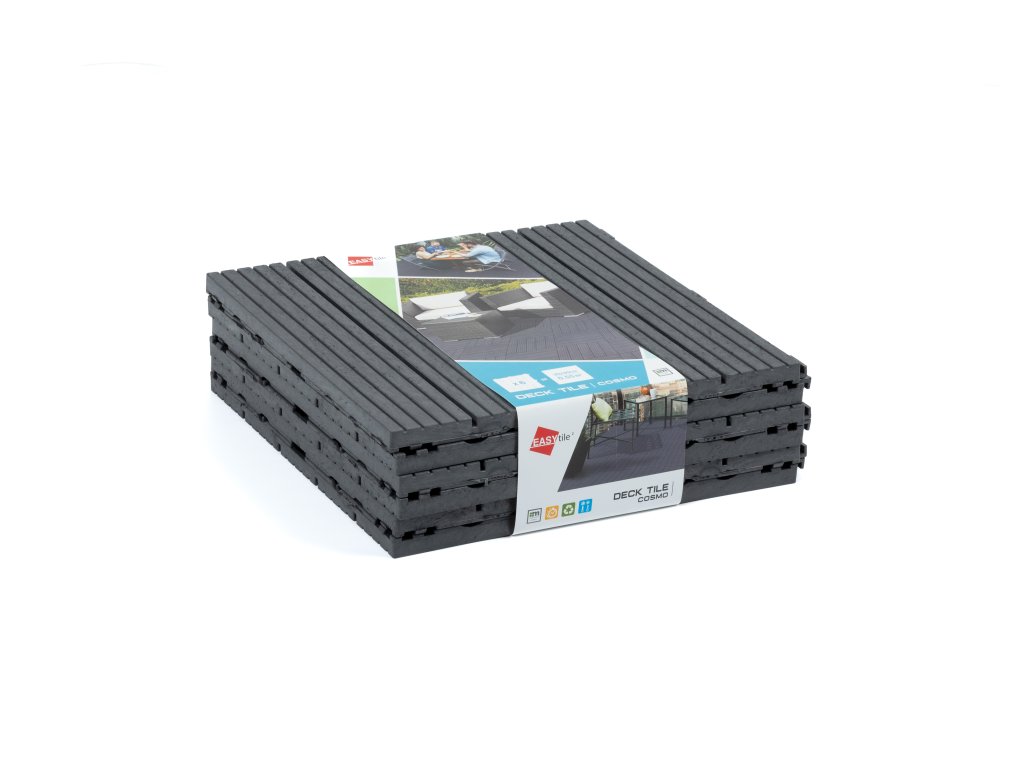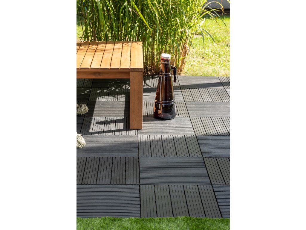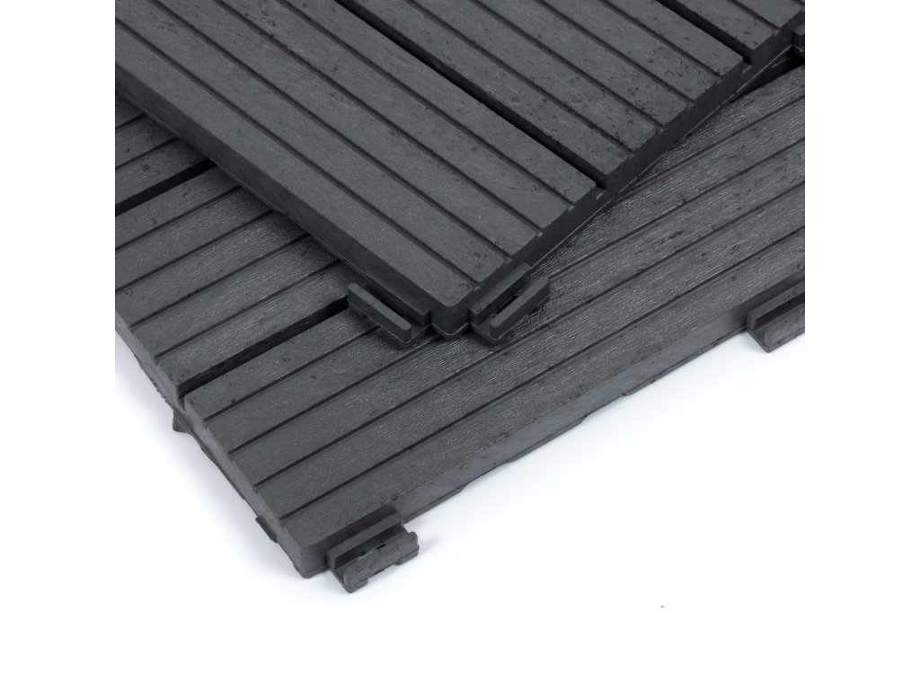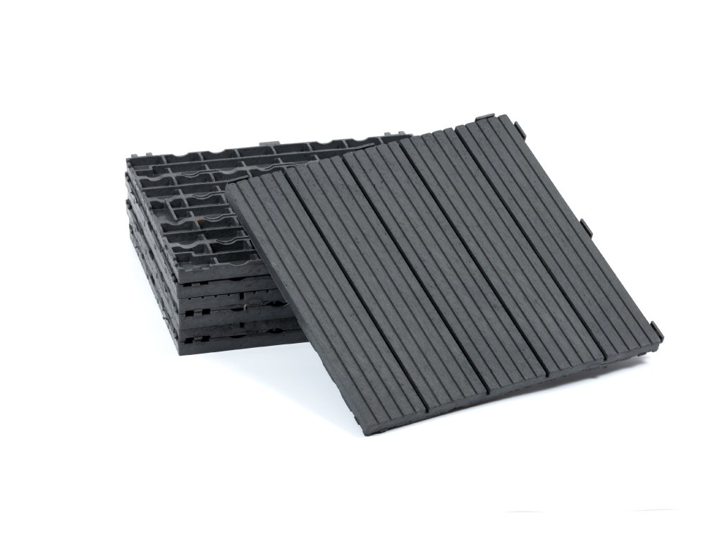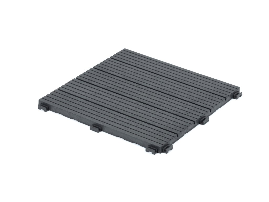 Gumová dlaždice 30 x 30 cm, výška 1,5 cm, v šedé barvě. Směs gumové pryže a polypropylenu s dlouhou životností a vysokou odolností. Velmi snadná montáž.