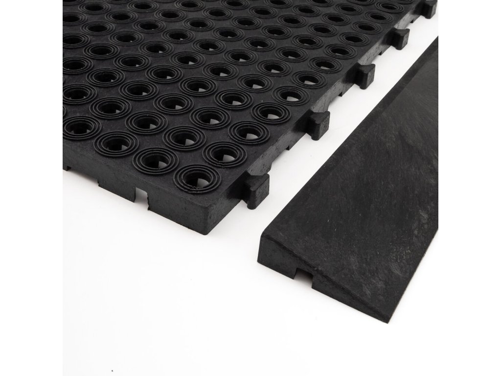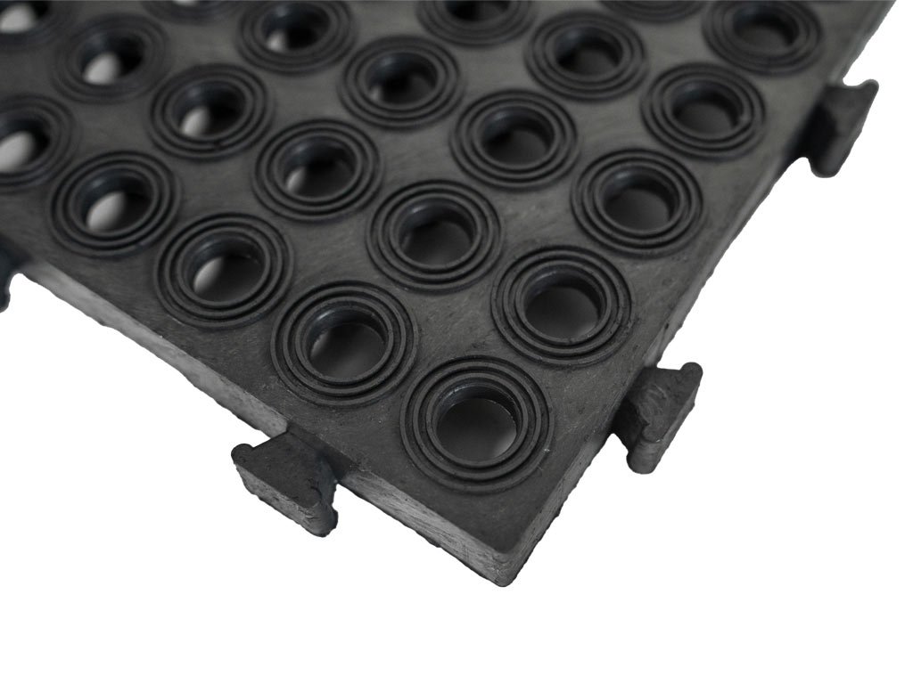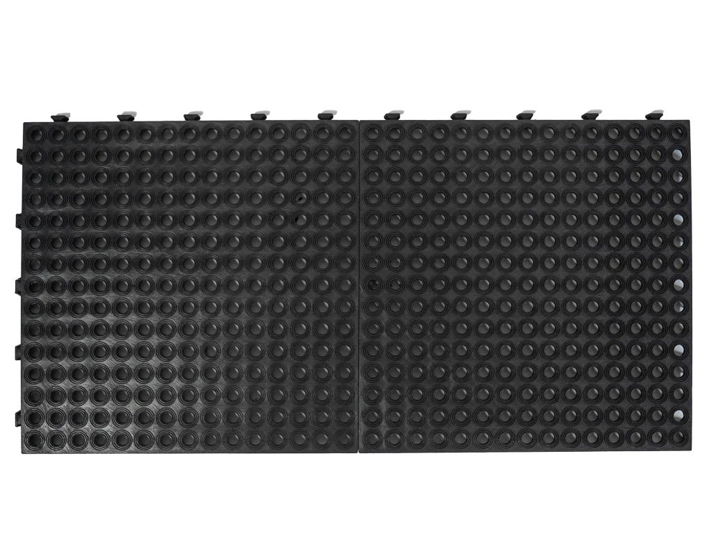 Gumová dlaždice 45 x 45 cm, zesílená tloušťka 2 cm, černá barva. Směs gumové pryže a polypropylenu (100% recyklované materiály) s dlouhou životností a vysokou odolností. Velmi snadná montáž. Vhodné do garáží, dílen nebo pod bazén.