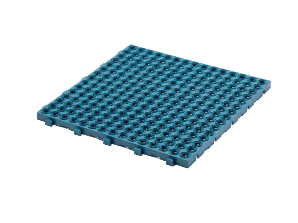 Gumová dlaždice 45 x 45 cm, zesílená tloušťka 2 cm, modrá barva. Směs gumové pryže a polypropylenu (100% recyklované materiály) s dlouhou životností a vysokou odolností. Velmi snadná montáž. Vhodné do garáží, dílen nebo pod bazén.