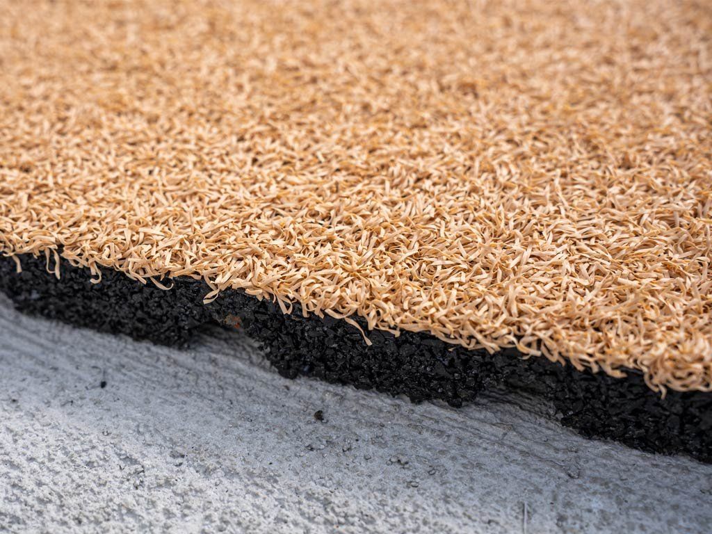 Gumová trávníková dlaždice ASLON 40 × 40 cm v barvě písková kombinuje výhody umělého trávníku a gumové dlaždice pro odolný a snadno udržovatelný povrch.