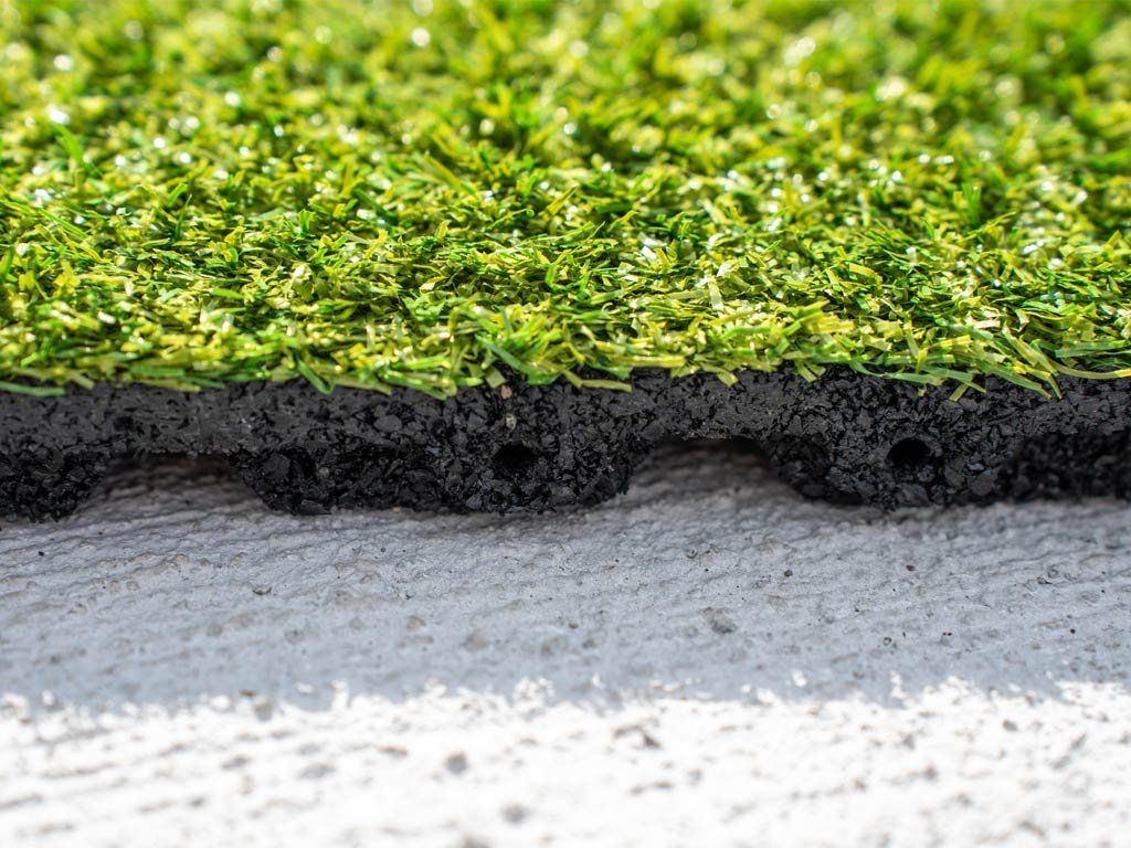 Gumová trávníková dlaždice ASLON 50 × 50 cm v barvě Moss Green kombinuje výhody umělého trávníku a gumové dlaždice pro odolný a snadno udržovatelný povrch.