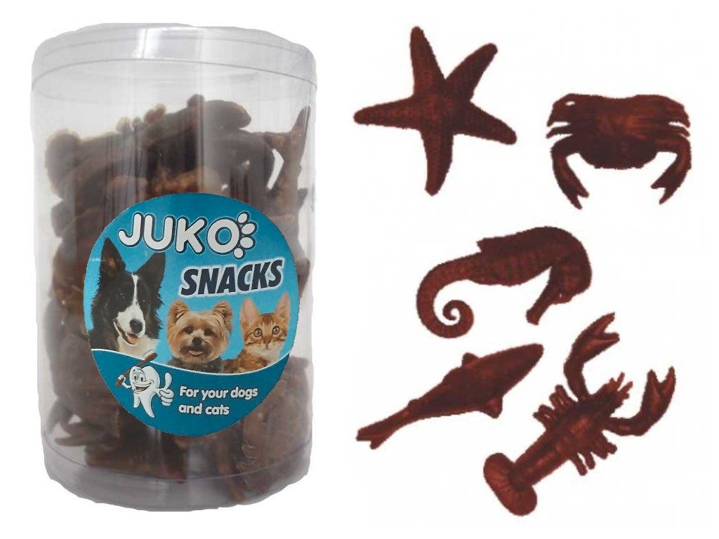 Lahodný pamlsek pro psy ve tvaru plodů moře s krabí příchutí.