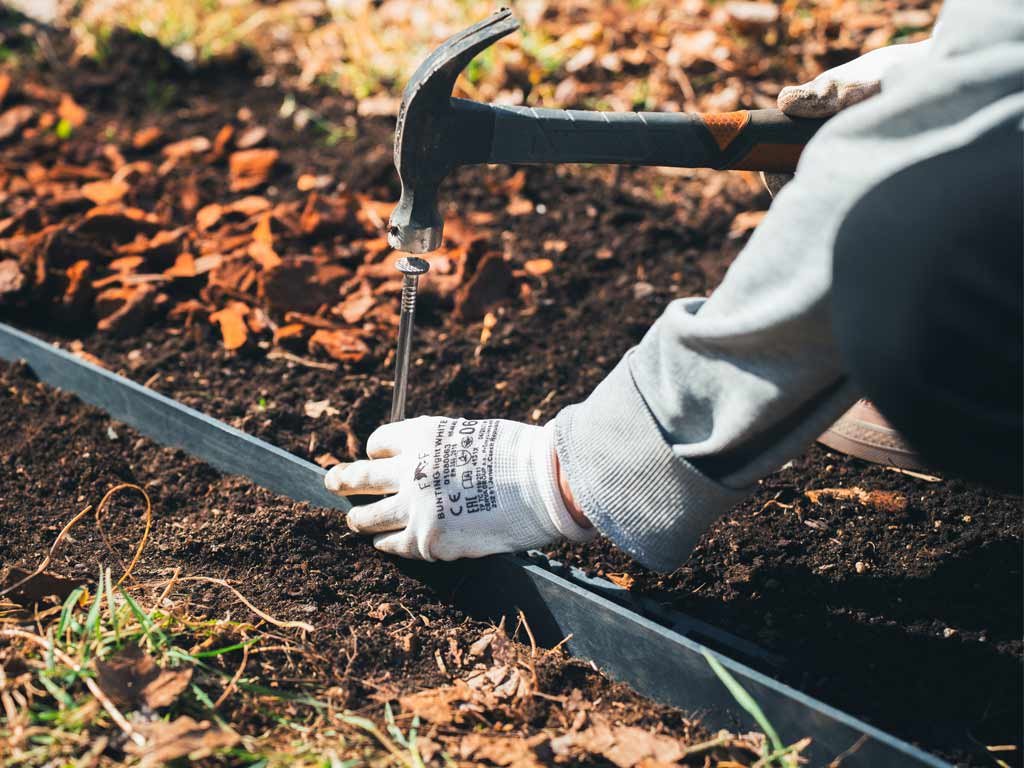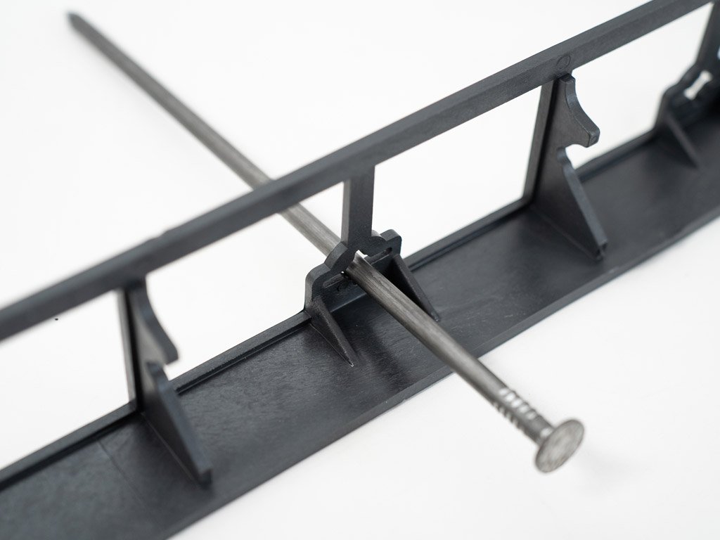 Při usazování rovného dílu plastového obrubníku vám postačí na 1 metr 2-3 kotvící hřeby. Pokud ovšem obrubník ohýbáte a tvarujete, je vhodné díl ukotvit 4-6 kotvícími hřeby. Na jednom dílu obrubníku IGEL délky 1 metr je vždy 6 otvorů pro kotvící hřeby. Do těchto otvorů pasují oba typy uvedených hřebů. K zatlučení hřebů postačí obyčejné kladivo či palice.