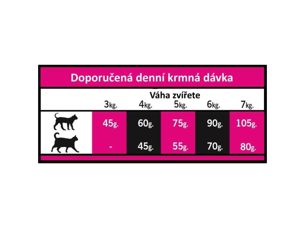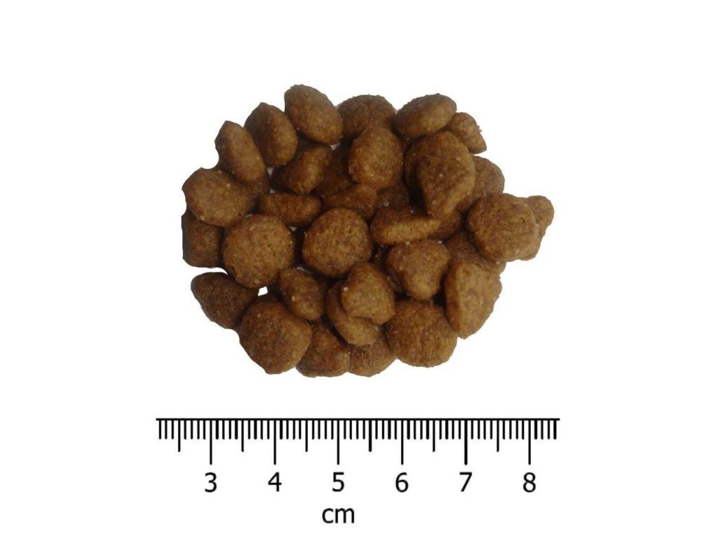 Analytické složky: Hrubý protein 33 %, hrubý olej a tuky 15 %, mastné kyseliny omega 6: 2,5 %, mastné kyseliny omega 3: 0,5 %, hrubá vláknina 3 %, celková dietní vláknina 7 %, hrubý popel 7 %, vápník 1,1 %, fosfor 0,9 %, vlhkost 9 %.