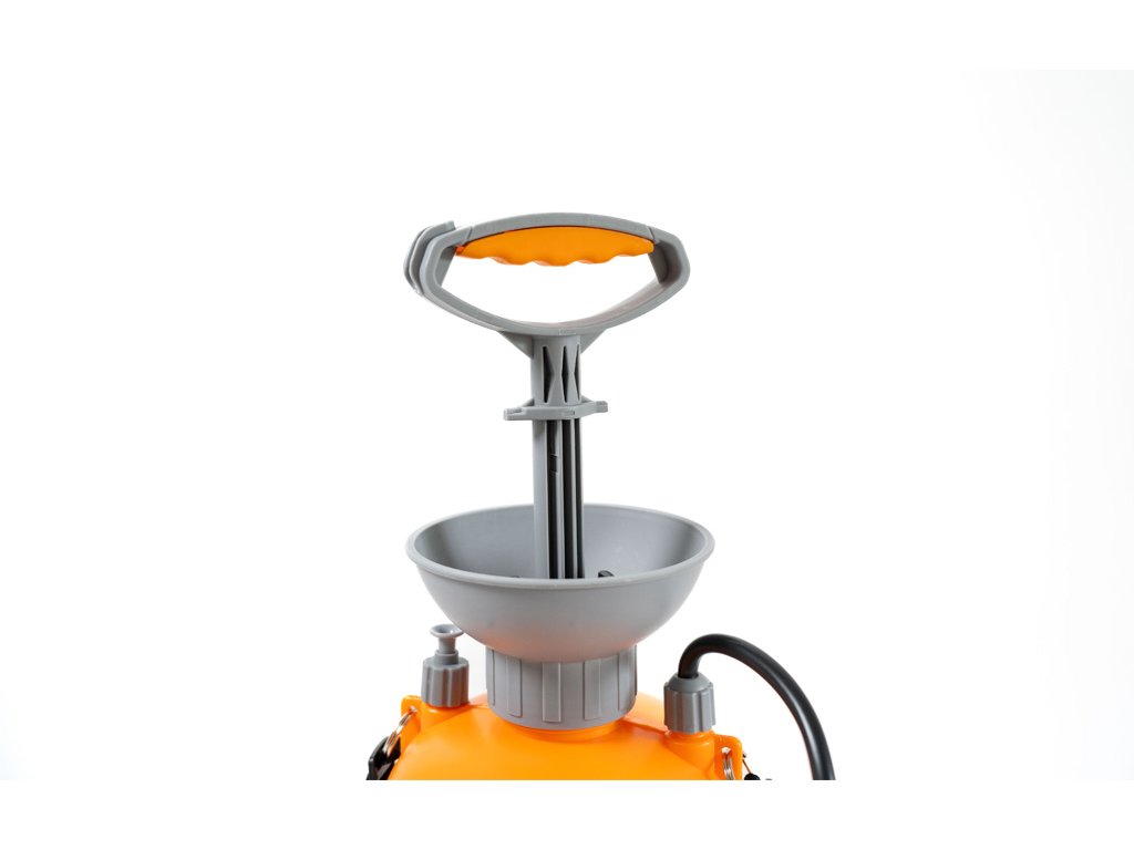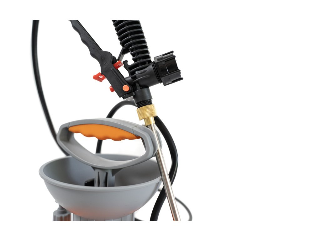 Tlakový postřikovač pracuje s maximálním tlakem 4 bary. Kontrolu hladiny 8litrové nádrže vidíte na boční měrce. Kuželová