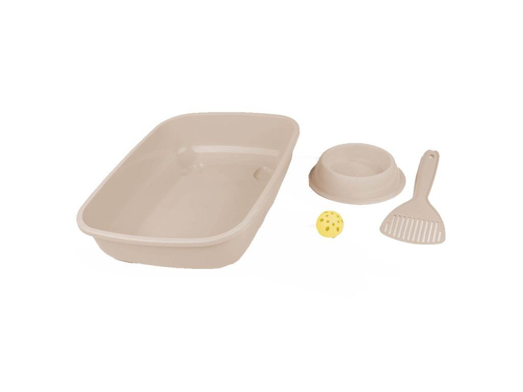 Startovací sada pro koťata. Sada obsahuje: misku, balonek, lopatku a WC Velikost WC: 37 x 27 x 8,5 cm Barva: béžová
