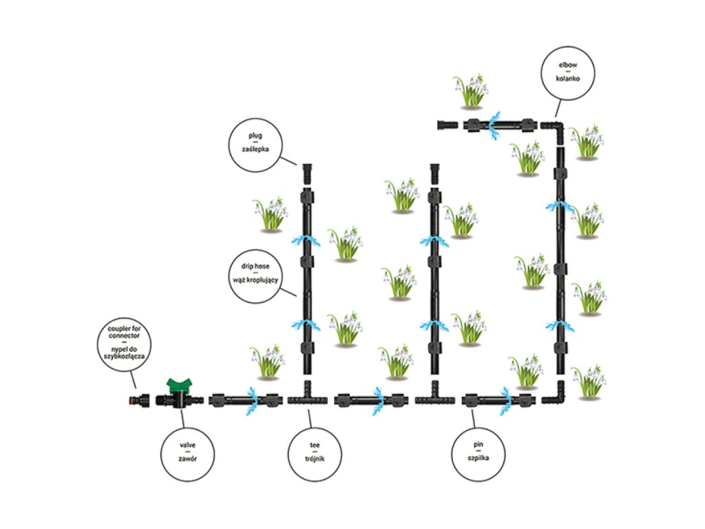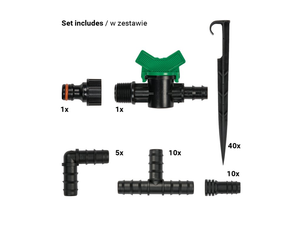 Set pro mikrozávlahu rostlin na zahradě nebo terase. Souvislá kapkovací hadice umožňuje díky přiloženým spojkám snadné nastavení rozestupů mezi zavlažovači. Ideální jak pro jednotlivé rostliny, tak pro liniovou závlahu živých plotů. Zavlažovací hadice rozvádí přesné množství vody do každého odkapávacího bodu.