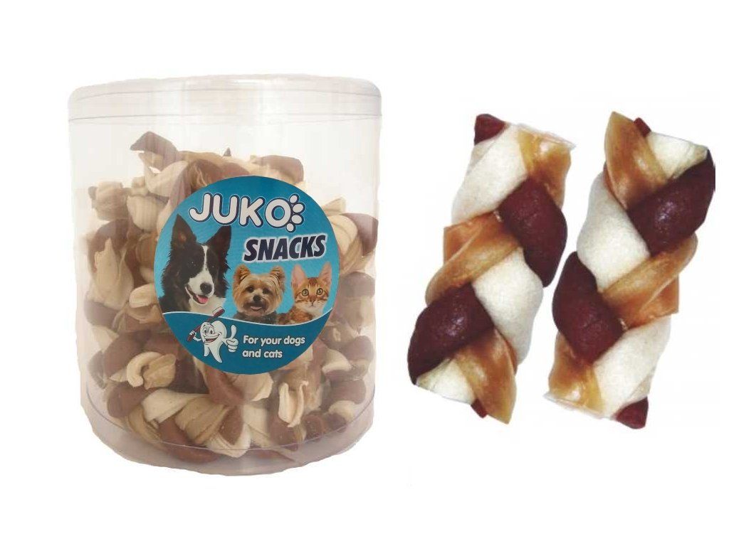 Bezlepkový pamlsek pro psy ve tvaru splétaného copánku s kuřecí příchutí.