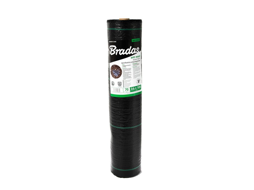 Tkaná mulčovací agrotextilie proti plevelům BRADAS černé barvy o rozměru 0,6 x 100 m, gramáž 70 g/m2. Díky svým vlastnostem má široké využití v zahradnictví, školkařství a zemědělství. Je velmi pevná a odolná proti UV záření.