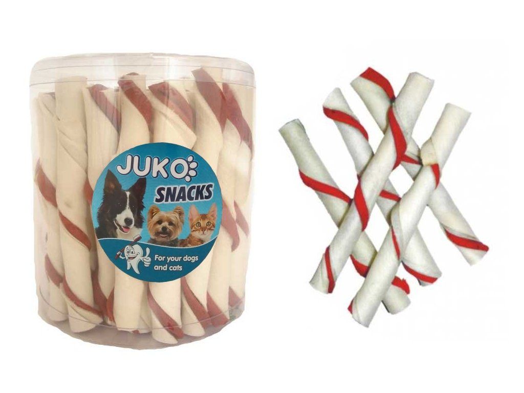 Bezlepková pochoutka pro psy ve tvaru trubiček z bělené kůže s hovězí příchutí.