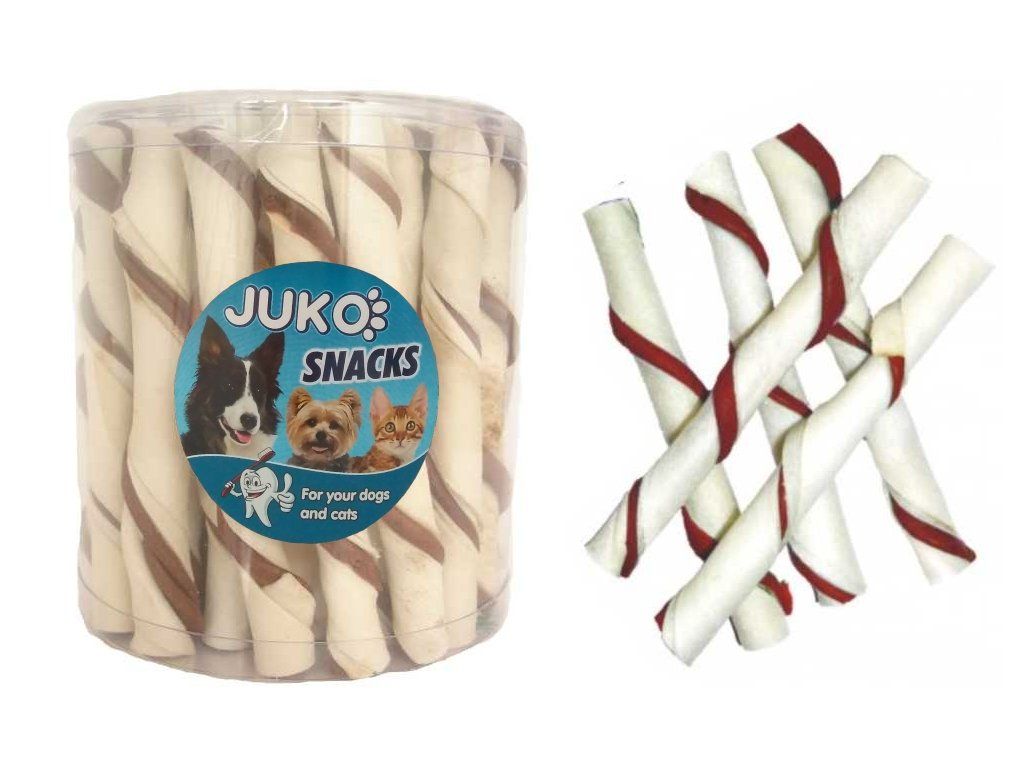 Bezlepková pochoutka pro psy ve tvaru trubiček z bělené kůže s kuřecí příchutí.