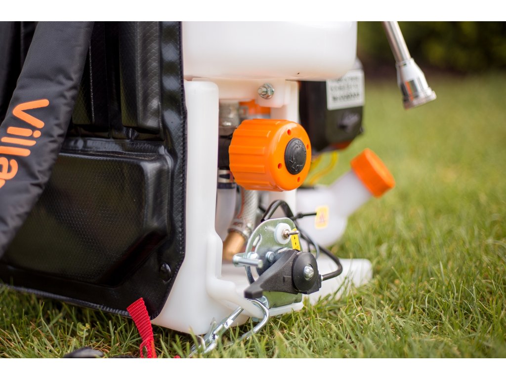 Benzínový zádový postřikovač VILLAGER s dvoutaktním motorem o objemu 25,4 cm³, objem nádrže 15 l, teleskopické prodloužení až na 1,85 m, trojitá tryska, regulátor tlaku, maximální tlak 25 bar. Vysokotlaké čerpadlo.