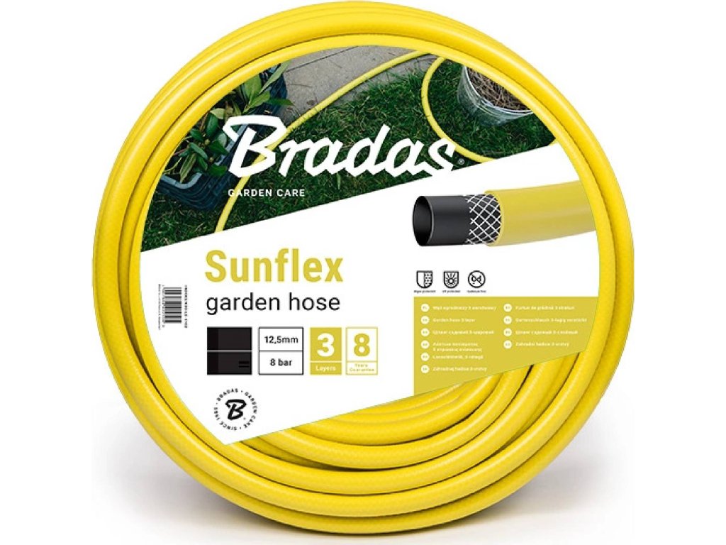 Vysoce kvalitní třívrstvá zahradní hadice BRADAS SUNFLEX o průměru 3/4" je vyrobená v kombinaci měkčeného a černého PVC materiálu, opatřena tlakovým opletením ze syntetických vláken. Tepelná odolnost hadice se pohybuje v rozmezí od -15º do + 60 ºC. Díky svému kvalitnímu zpracování je vhodná pro použití v zemědělství i na zahrádkách.