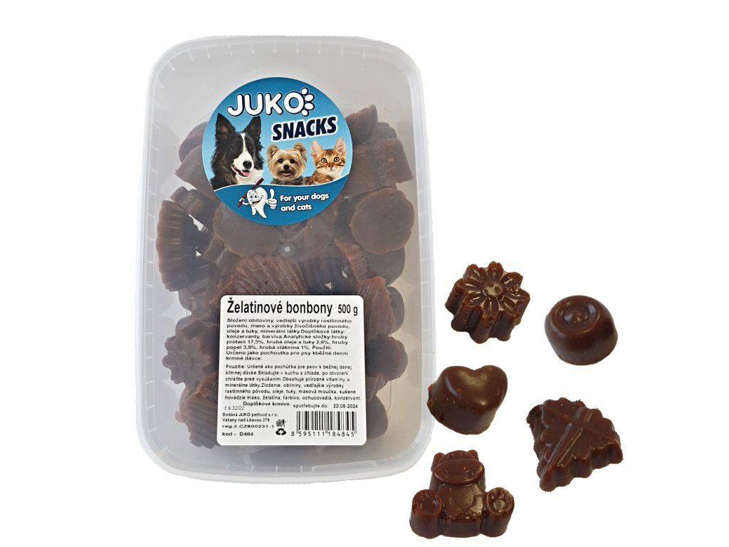 Želatinová pochoutka pro psy různých tvarů.